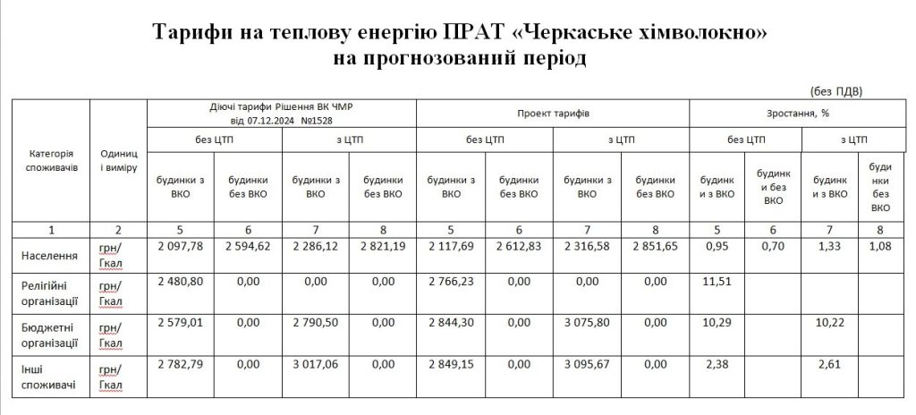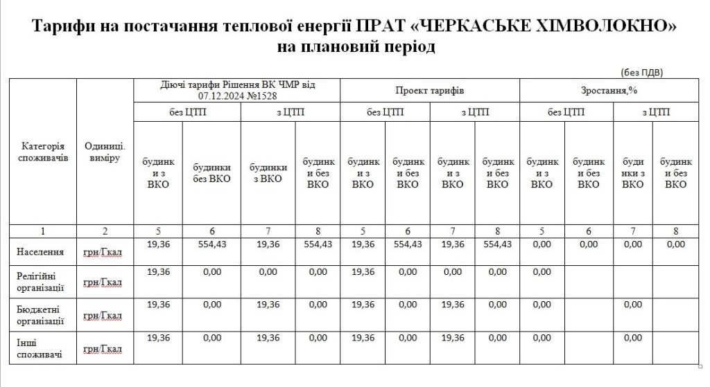 ПРАТ «Черкаське хімволокно» звернулося до Черкаської міської ради із заявою на коригування економічно обґрунтованих тарифів на теплову енергію, її виробництво, транспортування та постачання, а також на послугу з постачання теплової енергії, послугу з постачання гарячої води на розрахунковий період.