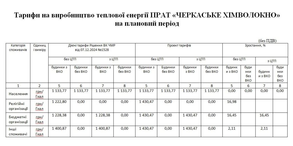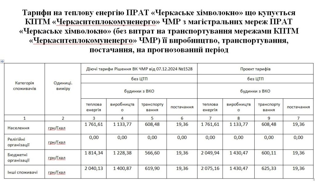 Зміна тарифів обумовлена прийняттям НКРЕКП нових тарифів на виробництво теплової енергії на ТЕЦ (Постанова НКРЕКП від 25.11.2025р. №1910 «Про внесення змін до постанови НКРЕКП від 29 грудня 2021 року № 2978»), а також зміною тарифів КПТМ «Черкаситеплокомуненерго» ЧМР.