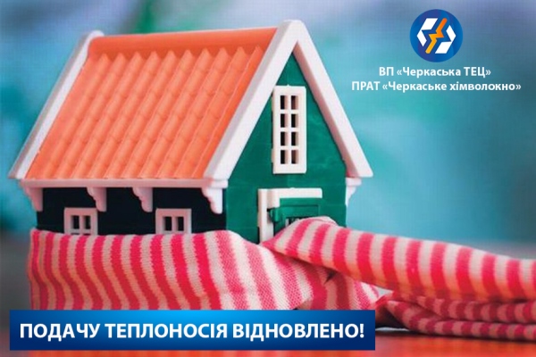 ВП «Черкаська ТЕЦ» ПРАТ «Черкаське хімволокно» повідомляє, що сьогодні, 18 листопада, по завершенню ремонтно-відновлювальних робіт на тепломережі, з 18:00 год. відновлено подачу теплоносія до будинків мікрорайону «Митниця».